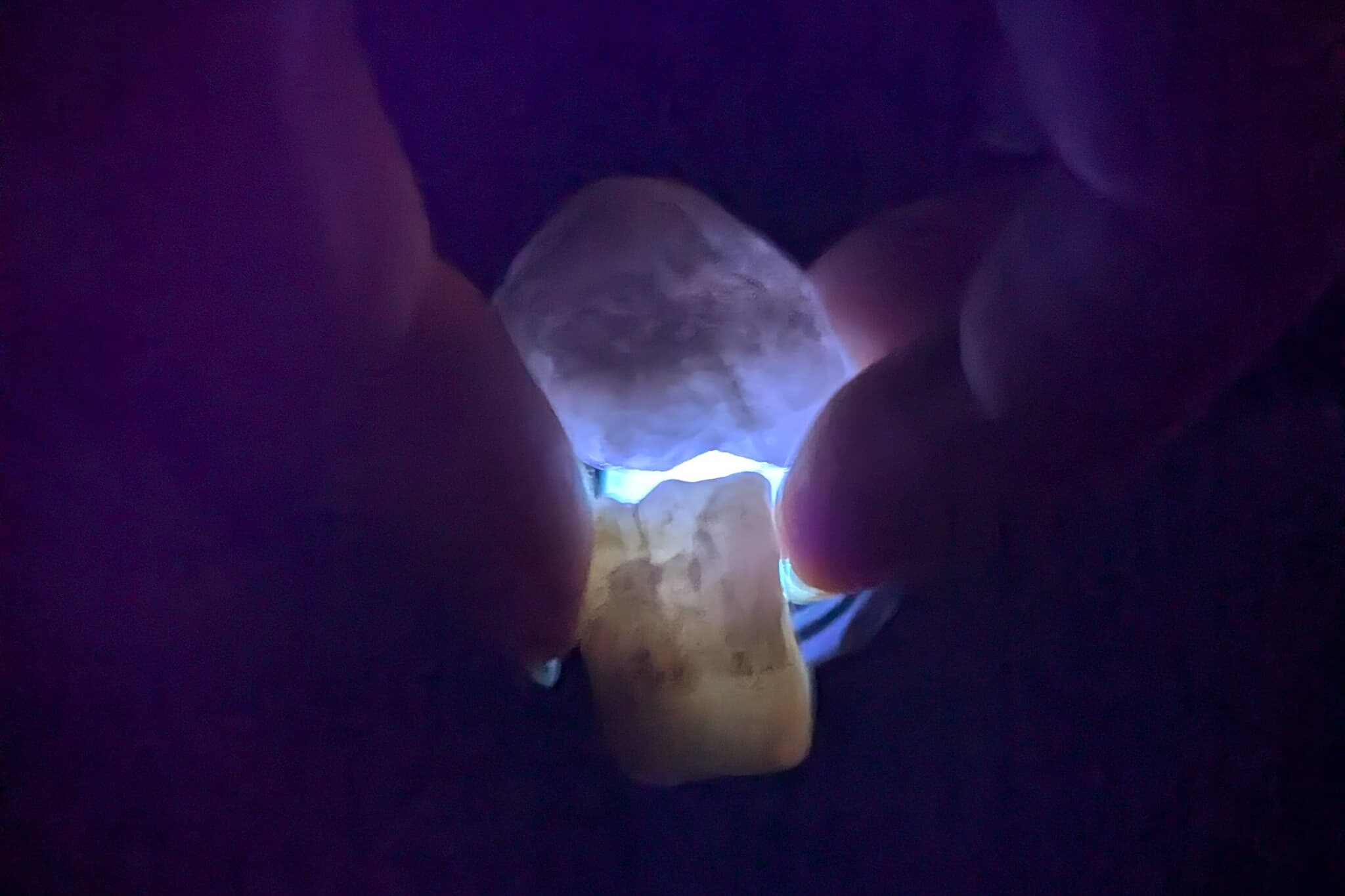 こうしてみると、上の石が青白く光ってて、下の石が薄っすら緑色に光るね。