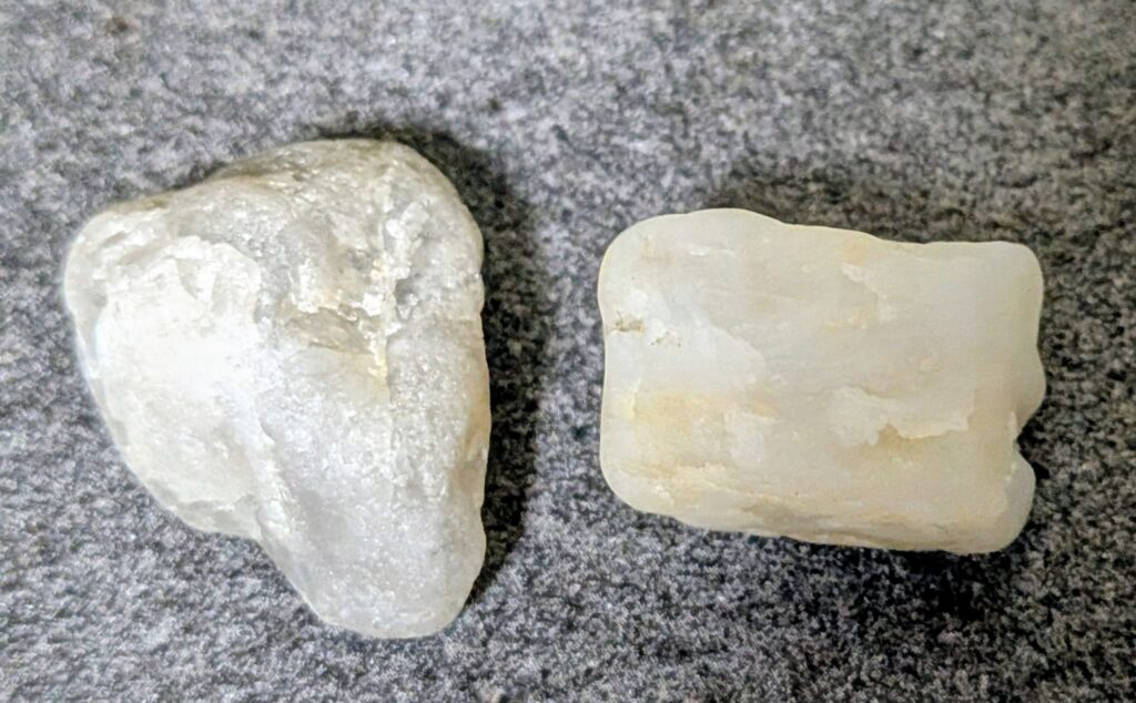 左が石英(もしくは玉髄?)で右が縞々模様入っててメノウっぽい。